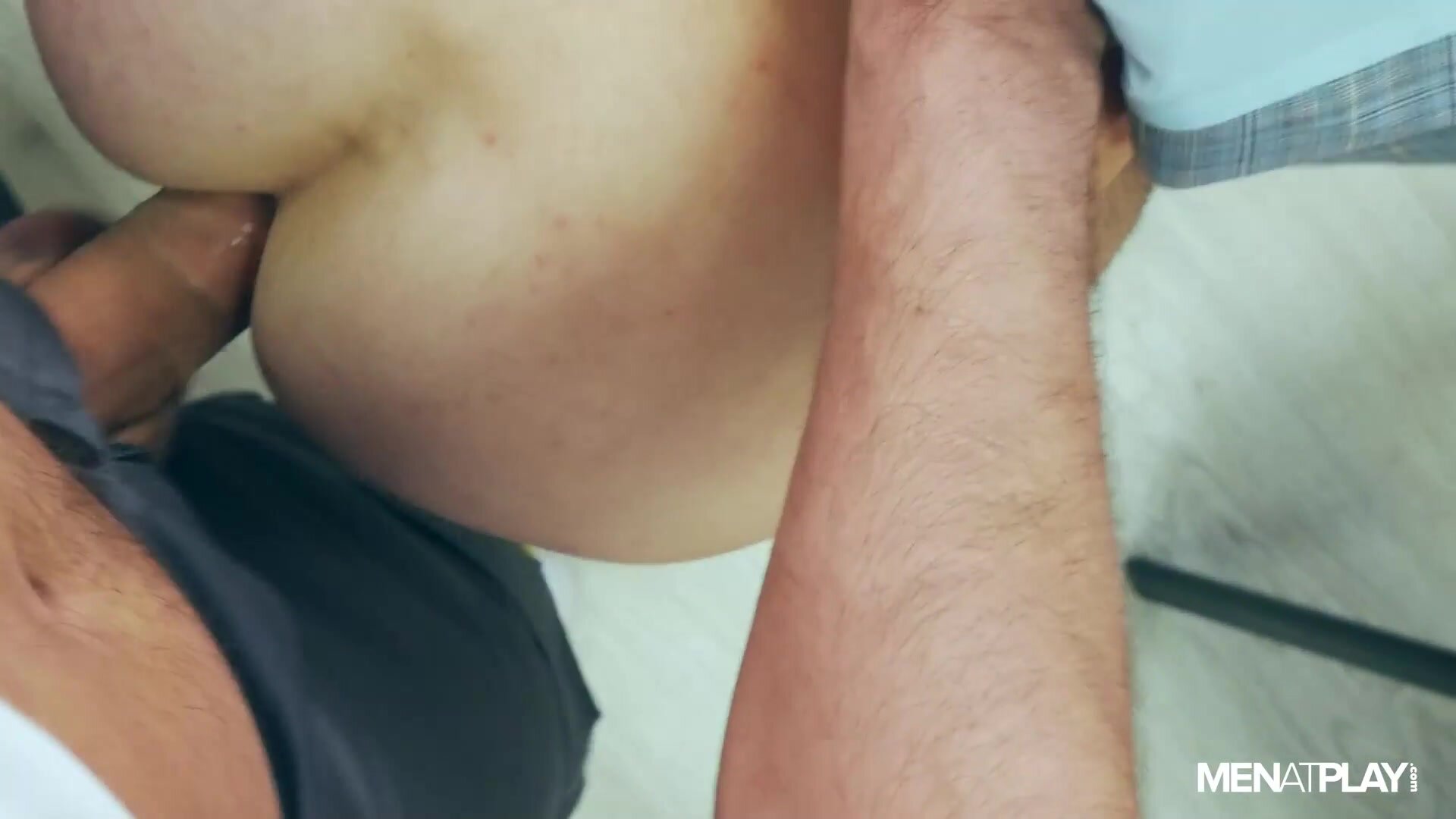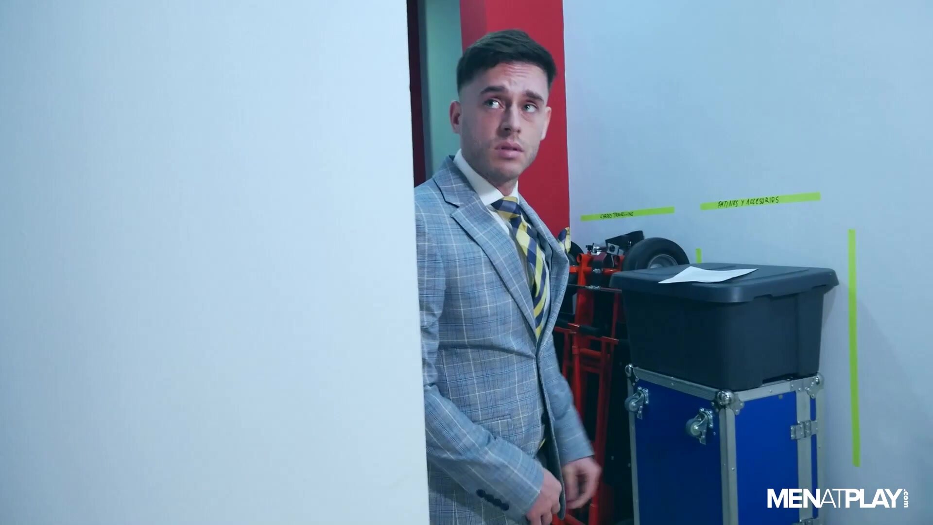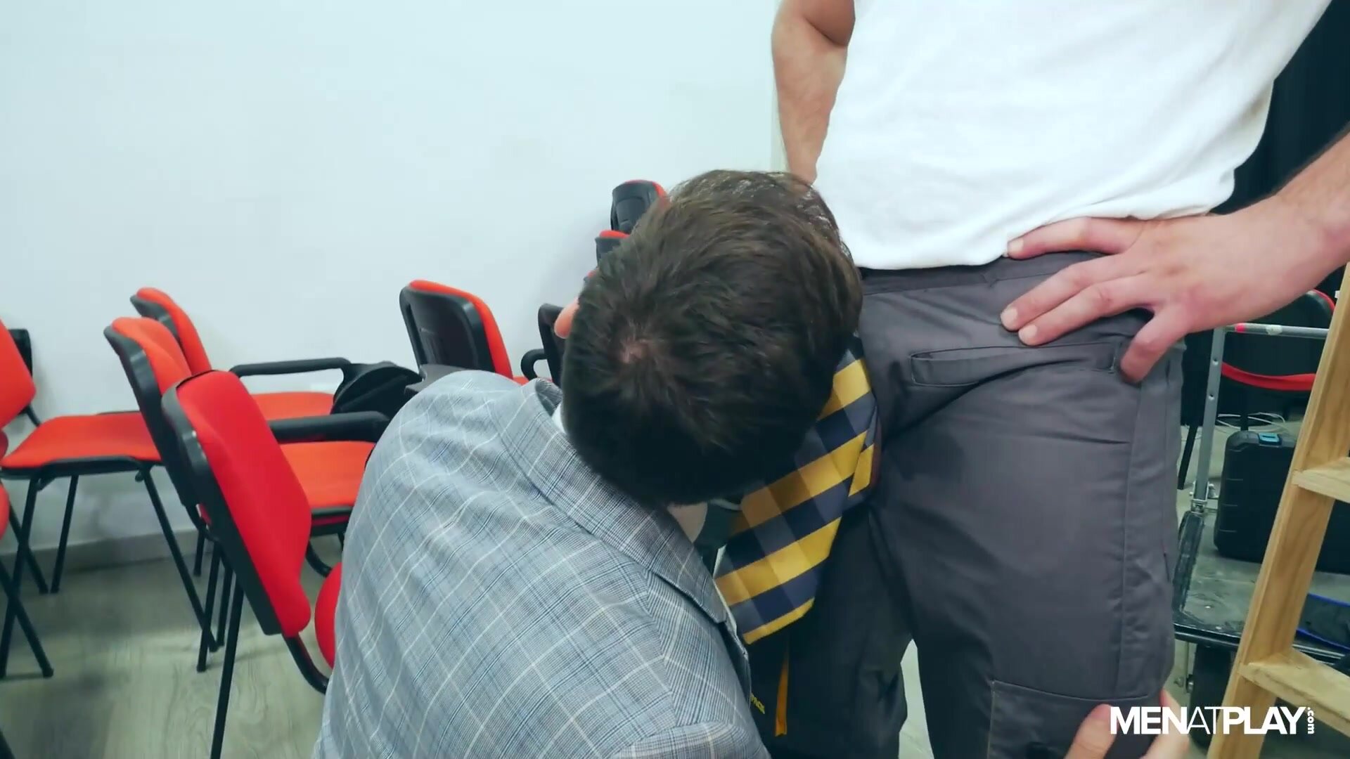 Manuel Reyes has been asked to work late and let in the technician who will repair the projector before a board meeting the following day. Manuel isn't happy about having had to wait around - until he meets the blue-collar stud, Cristian Sam. Cristian is wearing grey worker pants, a white t-shirt, and VPL (visible penis line).