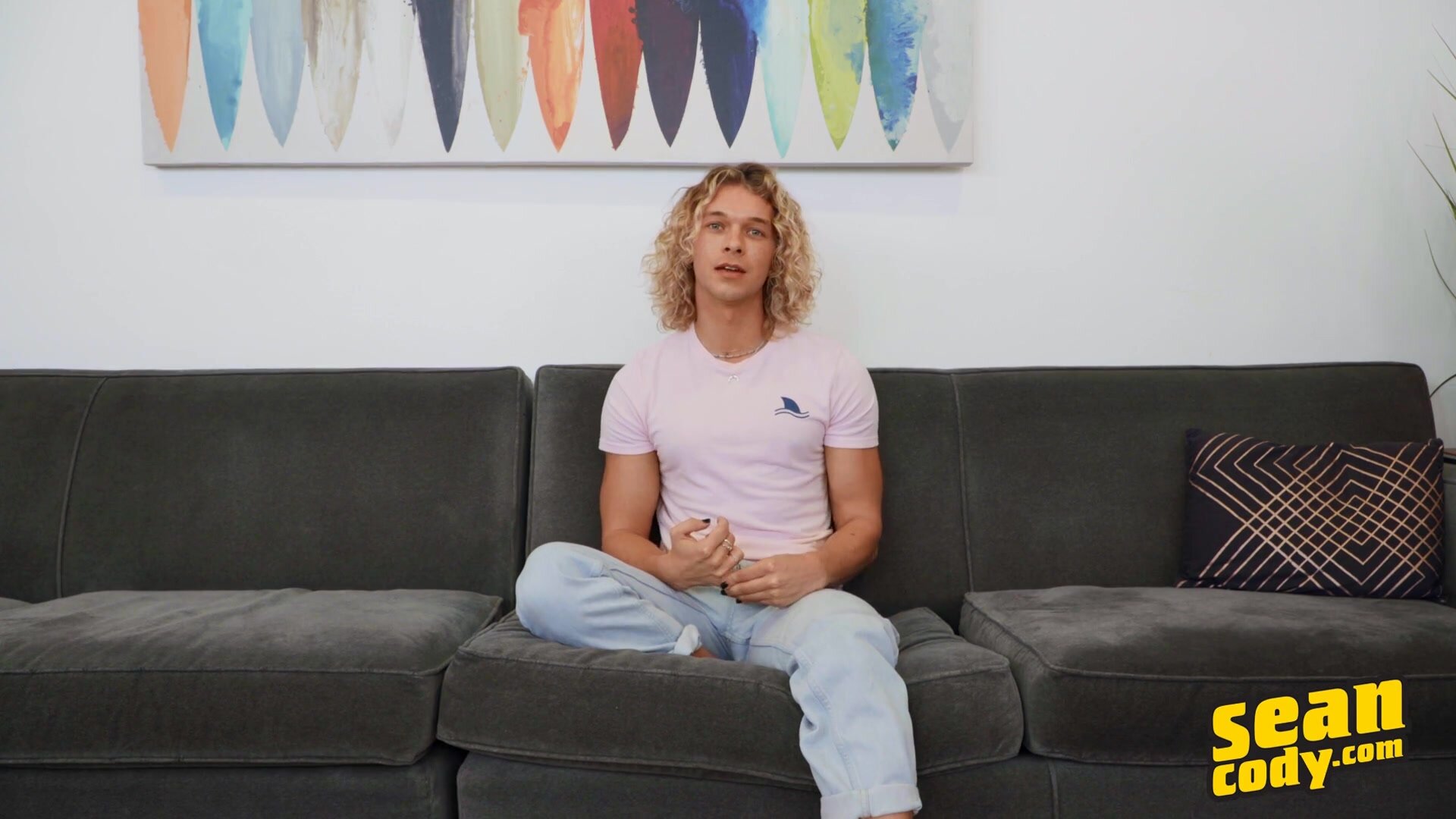 Where else could a golden-haired Adonis like Shawn hail from but California? As Shawn describes his very rigorous workout routine, you'll know that a perfect body is waiting under his casual jeans and t-shirt, but don't miss what this hunk says about his tastes in the bedroom! "When it comes to sex, I'm definitely more of a Dom top--No, I'm kidding," he says with a laugh. "I like to get fucked. Big-dick bottom is kind of my thing." You won't want to look away for a second as Shawn strips off his clothes and strokes his impressive cock, teasing his hole with his fingers. Shawn stands in the mirror as he jacks his cock, then lies back in piledriver pose till he blows a huge load all over himself. We can't wait for him to be back!