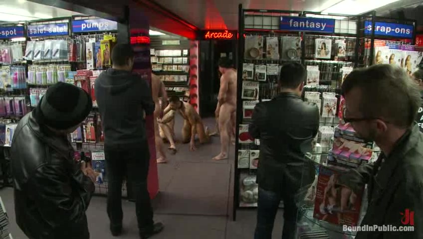 Horny men are cruising late night in South of Market. Christian Wilde and Nick Moretti take bound Emanuel into Folsom Gulch for some nasty action. They grope him in front of strangers and order horny bystanders to tear off his clothes. Emanuel is made to suck cocks in public. When he refuses to have a sex with a blowup doll, all hell breaks loose. After a hard flogging, Emanuel is humiliated by having to put his dick into the doll. The mob drags him into the video arcade and makes him service cocks. They take turns fucking him through the gloryhole. The horny dudes finish him off by double penetrating his ass and blow their hot loads all over his handsome face.