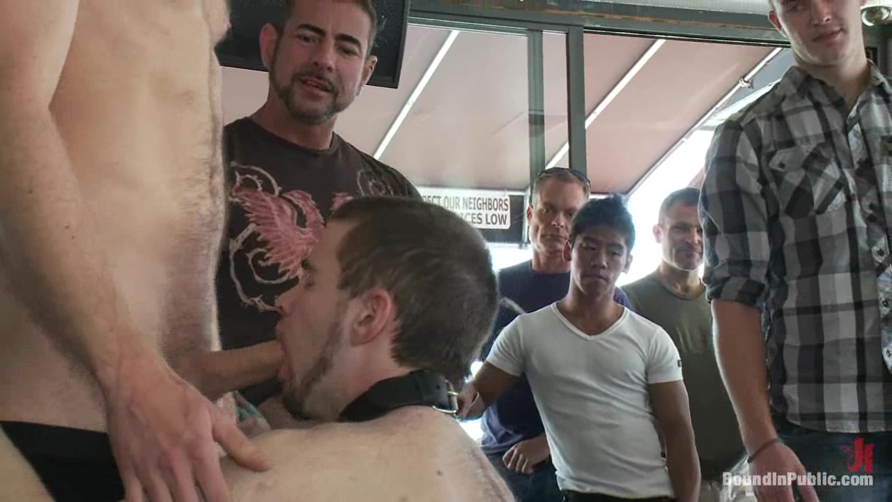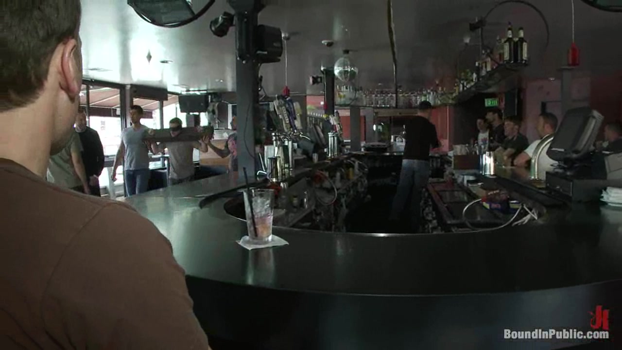 Not everyone can handle the crazy sex, abuse and humiliation of Bound in Pubic. Kyle Derring is put in a stockade and taken to a bar full of men during the day. They go to work on his hairy body right away and it's all too much for him to handle. Adam Port, another hairy stud, wants to take his place and the party begins. After Adam endures a heavy beating, he is made to crawl around on top of the bar begging to service cock. All good whores come with an air mattress. Adam blows one up and he is made to beg the bar patrons to fuck his hairy hole.